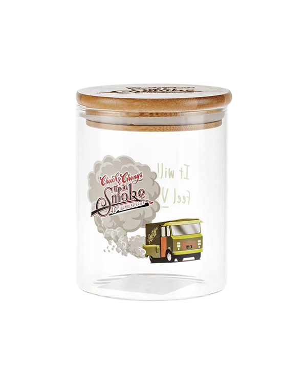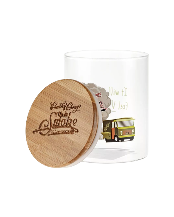 Keep your herbs in mint condition with the Glass Stash Jar from the Cheech and Chong collection. The jar is made from quality borosilicate glass and has a wooden lid with an etched Cheech and Chong “Up in Smoke” decal. The wooden lid has an airtight silicone seal that will keep your herbs fresh for a much longer period of time and prevents any unwanted odors from escaping.
